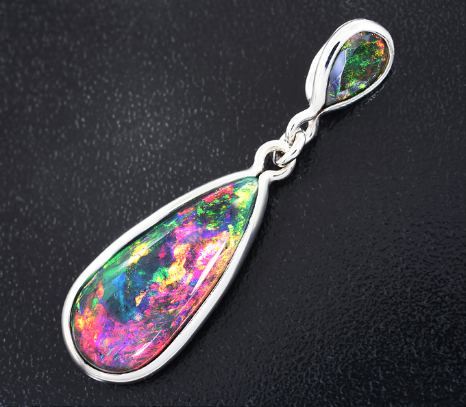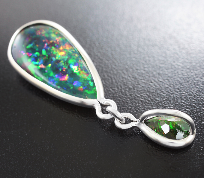 Вашему вниманию предлагается кулон из белого золота 585 пробы с кристаллическими черными опалами! Основные цвета опалесценции: красный, желтый и зеленый. Размеры кулона с петлей 45 х 12 мм. Вес изделия 3,2 г. Ниже приводятся ювелирные характеристики вставок.