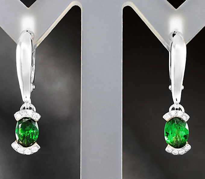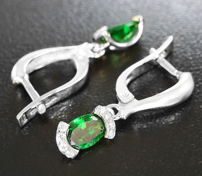 Вашему вниманию предлагаются серьги из белого золота 585 пробы с цаворитами гранатами и 16 бриллиантами! Диаметр дополнительной инкрустации 1,1 мм. Размеры серег с петлей 23 х 5 мм. Вес пары 2,6 г. Ниже приводятся ювелирные характеристики цаворитов.