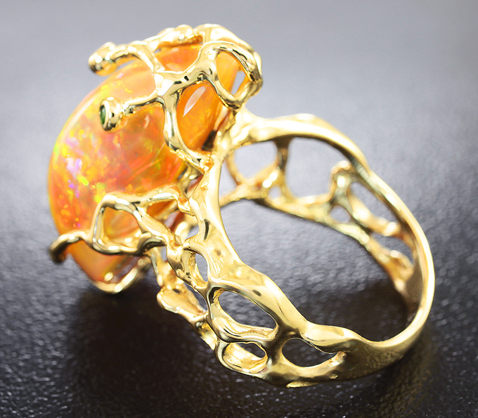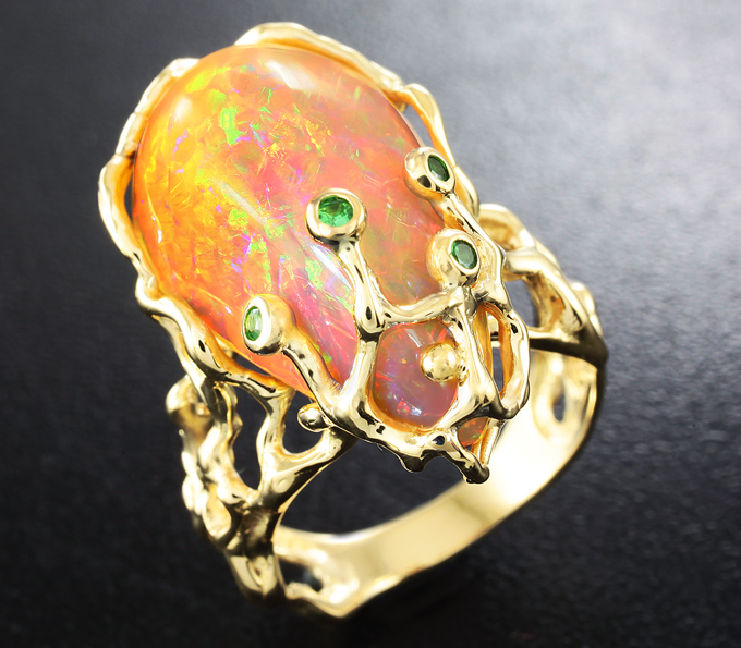 Вашему вниманию предлагается кольцо из желтого золота 585 пробы с кристаллическим эфиопским опалом и цаворитами гранатами! Основные цвета опалесценции: красный и желтый. Диаметр дополнительной инкрустации 1,5 мм. Площадка 24 х 15 мм, высота 12 мм. Вес изделия 7,1 г. Размер 16,5. Ниже приводятся ювелирные характеристики вставок.