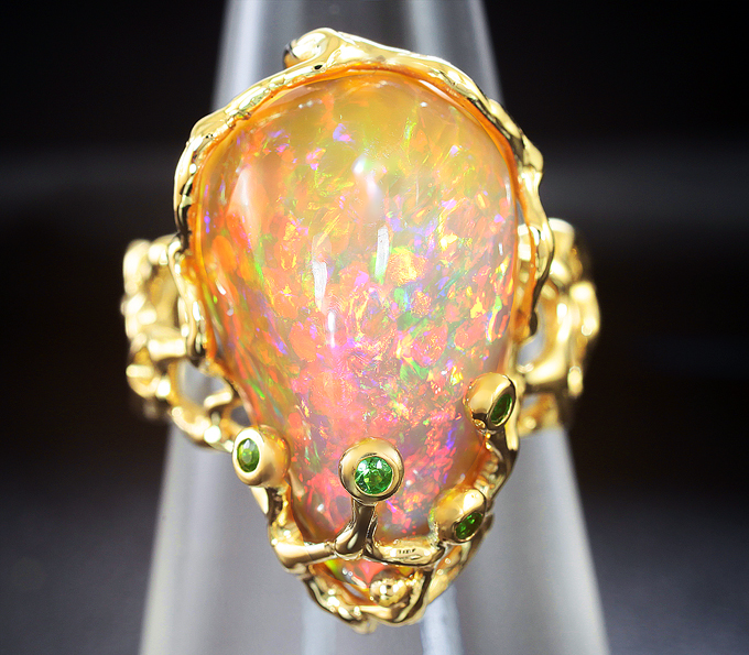 Кольцо с кристаллическим эфиопским опалом и цаворитами гранатами