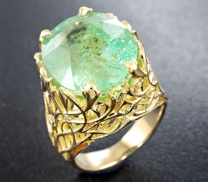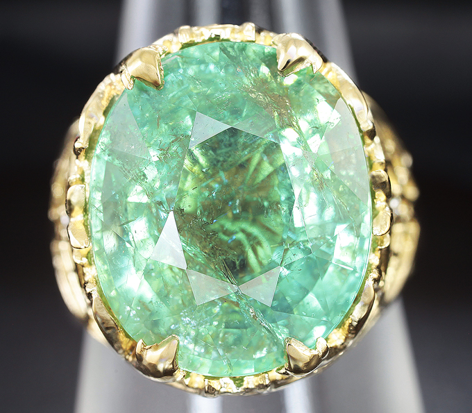 Вашему вниманию предлагается кольцо из желтого золота 585 пробы с крупным параиба турмалином и бриллиантами! Диаметр дополнительной инкрустации 1,1 мм. Площадка 18 х 16 мм, высота 12 мм. Вес изделия 10 г. Размер 16,5. Ниже приводятся ювелирные характеристики турмалина.
