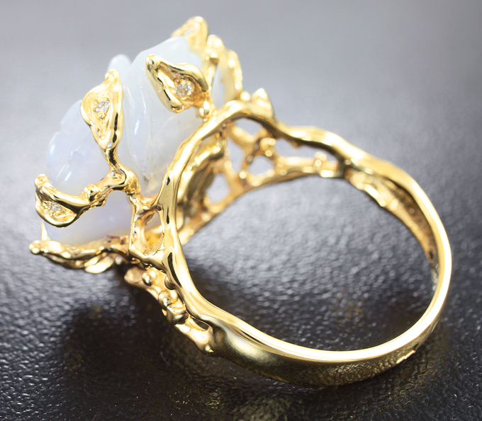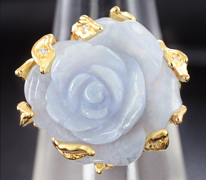 Вашему вниманию предлагается кольцо из желтого золота 585 пробы с резным халцедоном и бриллиантами! Диаметр дополнительной инкрустации 1,1 мм. Площадка 20 х 19 мм, высота 10 мм. Вес изделия 6,4 г. Размер 17,5. Ниже приводятся ювелирные характеристики халцедона.