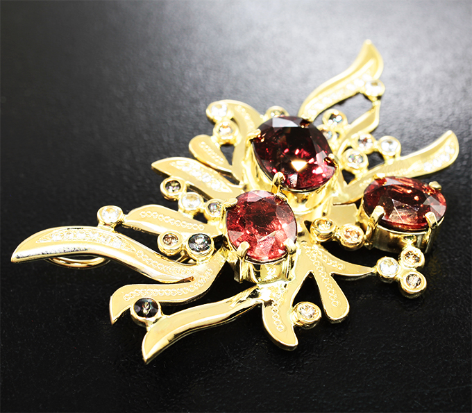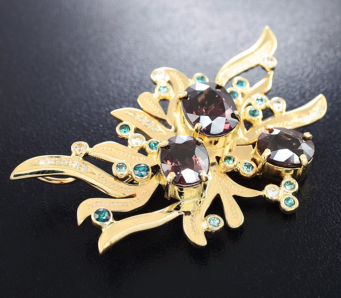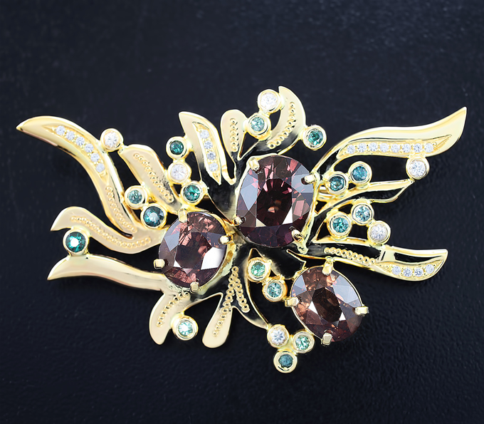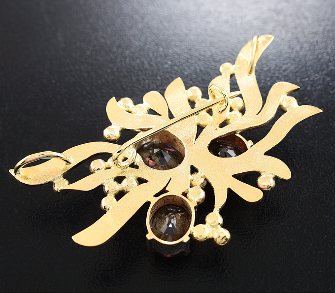 Вашему вниманию предлагается брошь/кулон из желтого золота 585 пробы c гранатами и цирконами! При смене осцвещения гранаты меняют свой цвет на красный. Размеры вставок от 1 мм до 10,7 х 8,5 мм. Площадка 54 х 34 мм. Вес изделия 14,6 г.