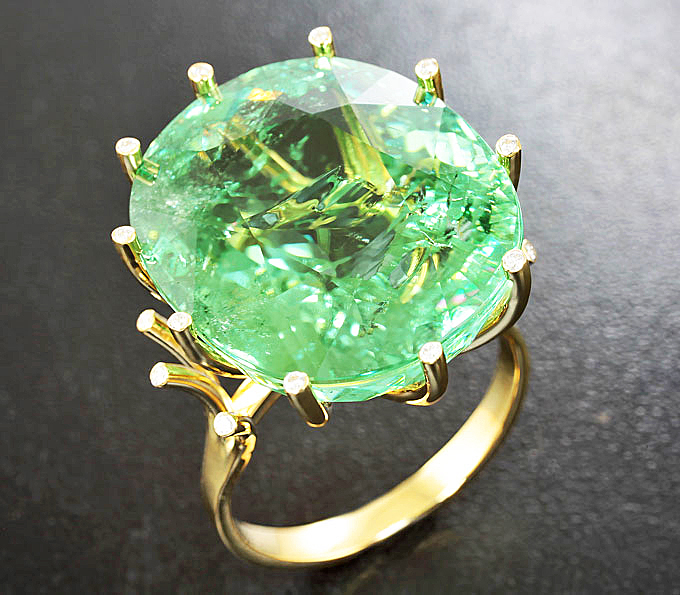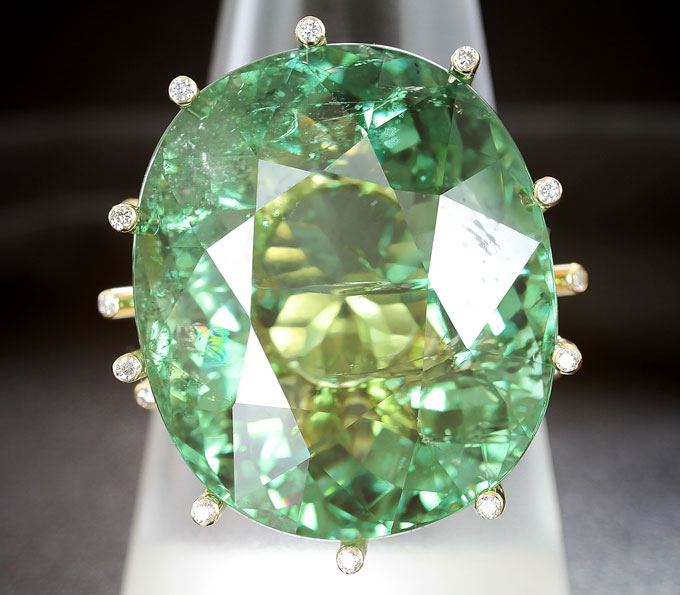 Вашему вниманию предлагается кольцо из желтого золота 585 пробы с крупным турмалином и бриллиантами! Диаметр дополнительной инкрустации 1,1 мм. Площадка 25 х 24 мм, высота 14 мм. Вес изделия 13,7 г. Размер 20. Ниже приводятся ювелирные характеристики турмалина.