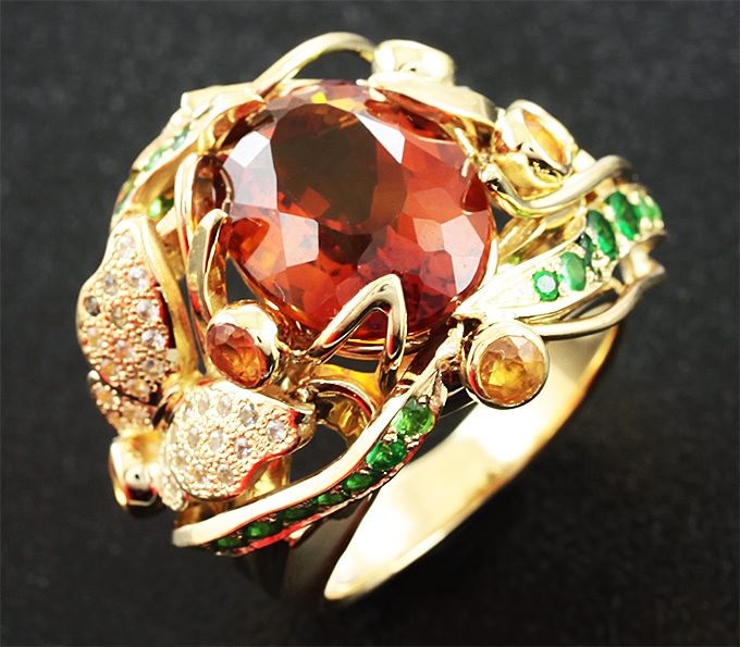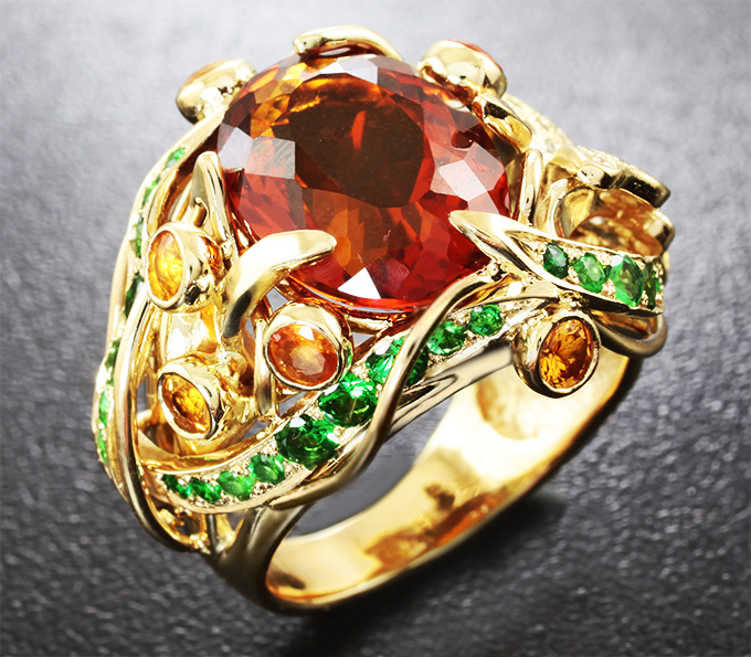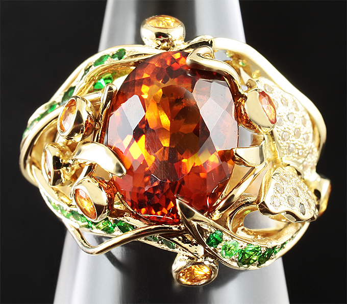 Золотое кольцо с редким цитрином мадейра, цаворитами, желтыми и бесцветными сапфирами
