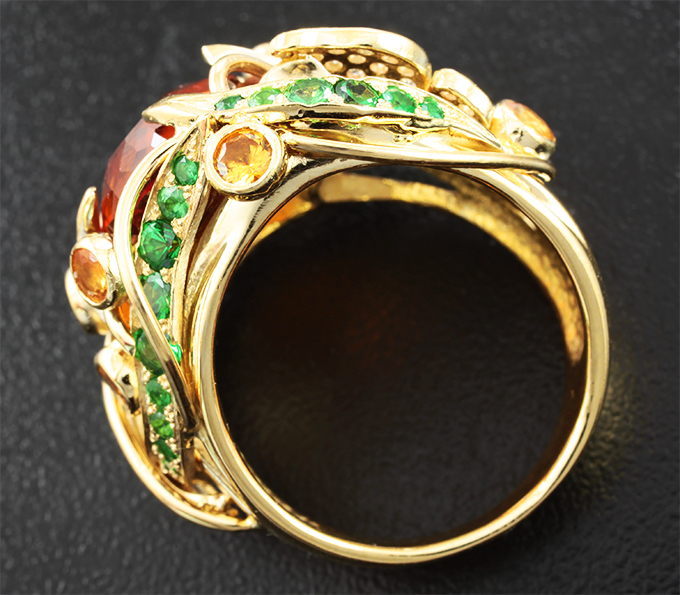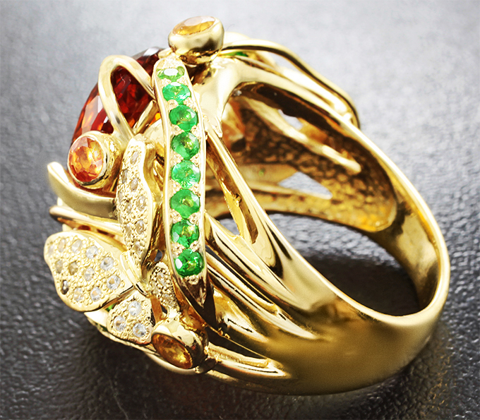 Вашему вниманию предлагается кольцо из желтого золота 585 пробы с редким цитрином мадейра, цаворитами гранатами, желтыми и бесцветными сапфирами! Диаметр дополнительной инкрустации от 1 мм до 2,5 мм. Площадка 26 х 22 мм, высота 9 мм. Вес изделия 14,3 г. Размер 18. Ниже приводятся ювелирные характеристики цитрина.