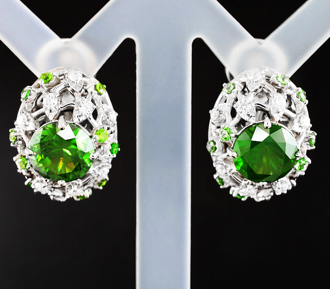 Вашему вниманию предлагаются серьги из белого золота 585 пробы с крупными уральскими демантоидами гранатами, малыми демантоидами и бриллиантами! Диаметр дополнительной инкрустации 2 мм и 2,5 мм. Площадка серег 20 х 15 мм. Вес пары 9,9 г. Ниже приводятся ювелирные характеристики крупных демантоидов.