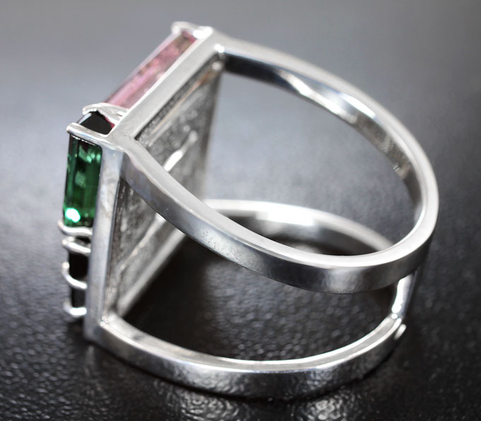Вашему вниманию предлагается кольцо из стерлингового серебра (925 проба) c разноцветными турмалинами! Площадка 17 х 17 мм, высота 4 мм. Вес изделия 7,9 г. Размер 18,25. Ниже приводятся ювелирные характеристики вставок.