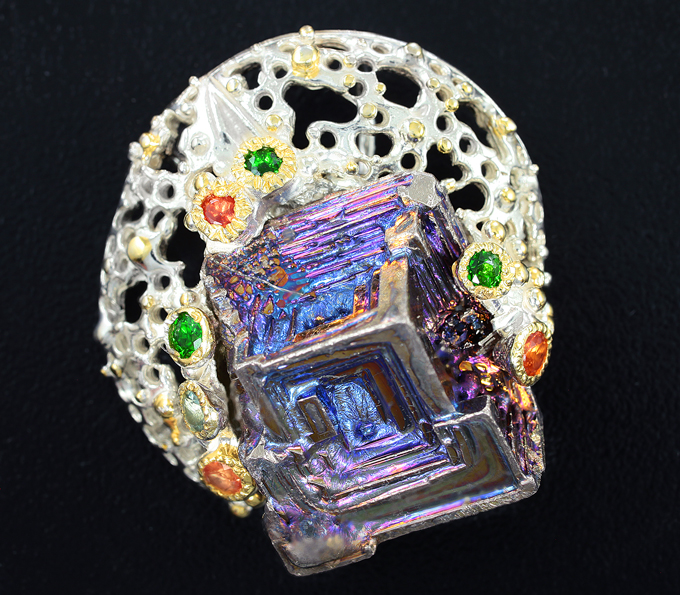 Вашему вниманию предлагается кулон из стерлингового серебра (925 проба) c висмутом, диопсидами и сапфирами! Изделие частично позолочено. Размеры вставок 2 мм и 20 х 17 мм. Площадка 34 х 31 мм. Вес изделия 21,4 г.