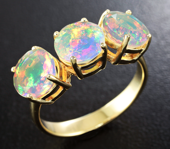 Вашему вниманию предлагается кольцо из желтого золота 585 пробы с ограненными эфиопскими опалами! Основные цвета опалесценции: красный, желтый и зеленый. Площадка 21 х 7 мм, высота 5 мм. Вес изделия 3,19 г. Размер 17,25. Ниже приводятся ювелирные характеристики вставок.