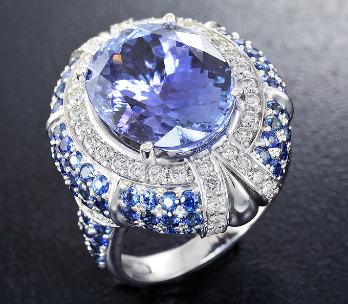 Кольцо с чистейшим танзанитом, синими сапфирами и бриллиантами