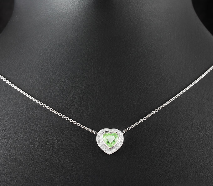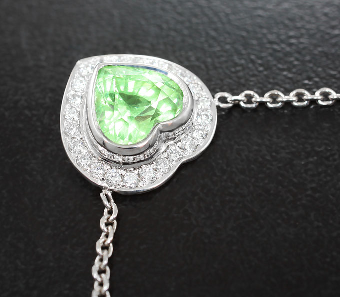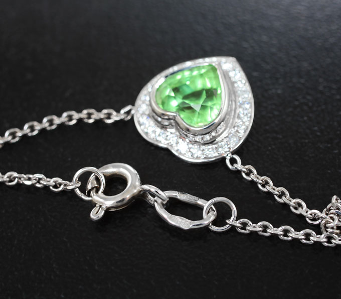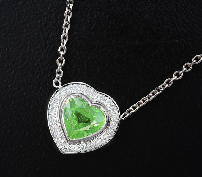 Вашему вниманию предлагается кулон из белого золота 585 пробы с цаворитом гранатом и 24 бриллиантами! Диаметр дополнительной инкрустации 1 мм. Площадка кулона 13 х 11 мм. Вес изделия 3,2 г. Длина цепочки 420 мм. Ниже приводятся ювелирные характеристики цаворита.