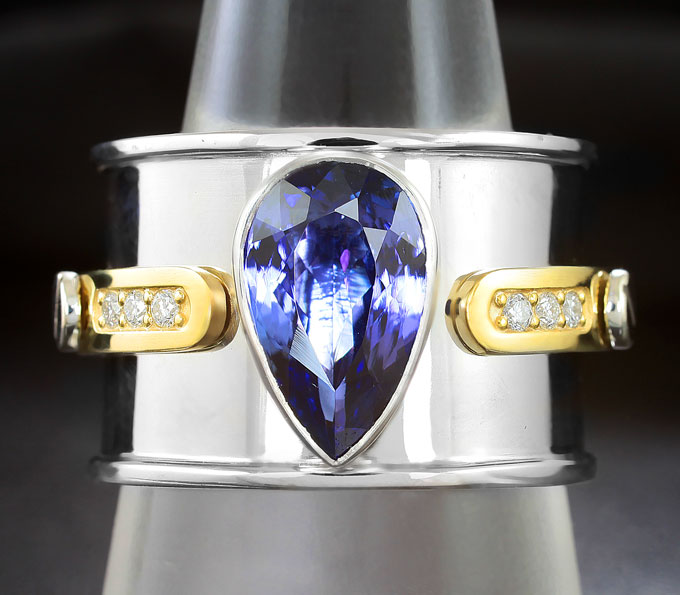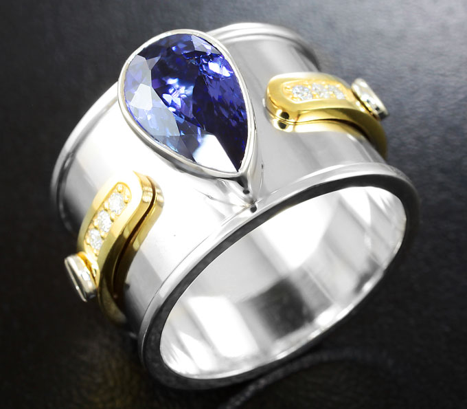 Вашему вниманию предлагается кольцо из стерлингового серебра (925 проба) c танзанитами и бриллиантами! Изделие частично позолочено. Диаметр дополнительной инкрустации 1,5 мм. Ширина площадки 15 мм, высота 7 мм. Вес изделия 14,3 г. Размер 18,75. Ниже приводятся ювелирные характеристики танзанита.