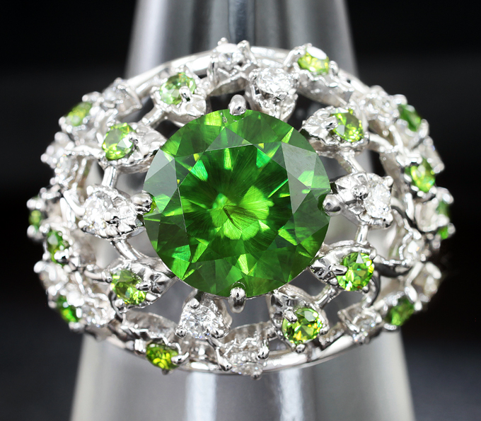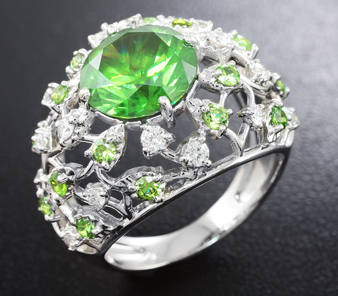Кольцо с топовым уральским демантоидом гранатом, малыми демантоидами и бриллиантами