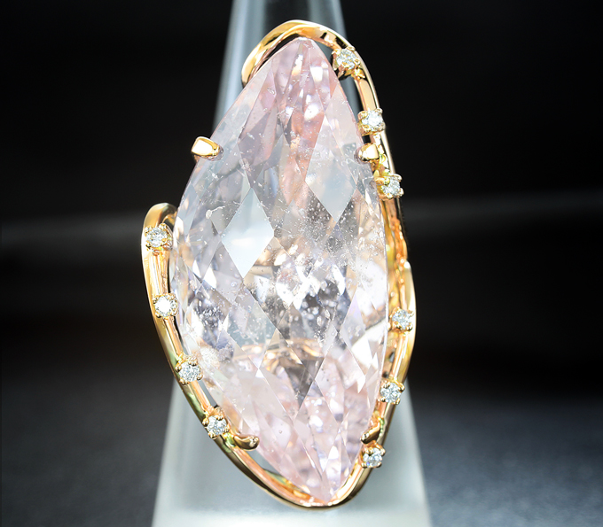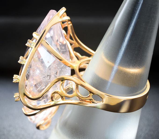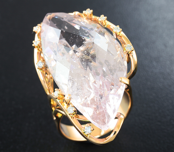 Вашему вниманию предлагается кольцо из красного золота 585 пробы с крупным морганитом и бриллиантами! Диаметр дополнительной инкрустации 1,5 мм. Площадка 37 х 20 мм, высота 15 мм. Вес изделия 13,86 г. Размер 17,5. Ниже приводятся ювелирные характеристики морганита.