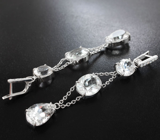 Вашему вниманию предлагаются серьги из стерлингового серебра (925 проба) с бесцветными топазами и 12 бриллиантами! Диаметр дополнительной инкрустации 1,5 мм. Размеры серег с петлей 75 х 10 мм. Вес пары 13,1 г. Ниже приводятся ювелирные характеристики топазов.
