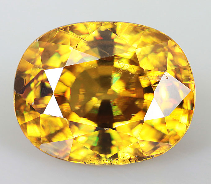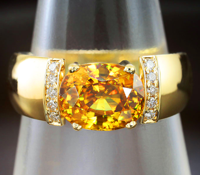 Вашему вниманию предлагается кольцо из желтого золота 585 пробы с золотистым сфеном и 10 бриллиантами! Диаметр дополнительной инкрустации 1,1 мм. Ширина площадки 7 мм, высота 5 мм. Вес изделия 3,9 г. Размер 16,5. Ниже приводятся ювелирные характеристики сфена.