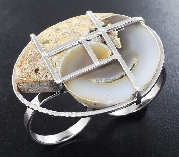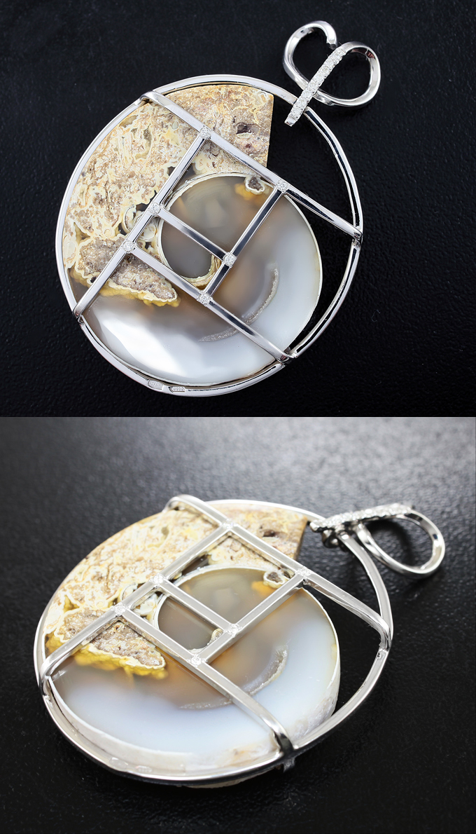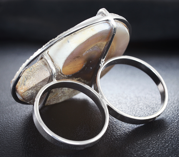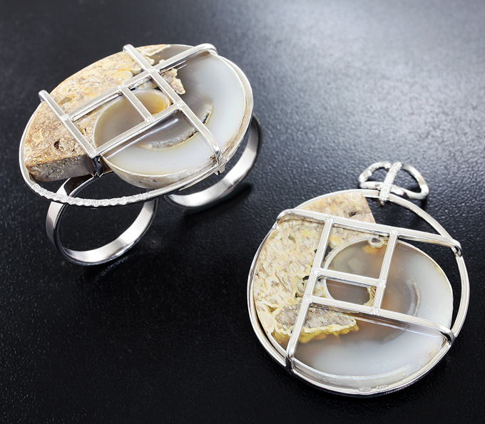 Вашему вниманию предлагается комплект (кольцо + кулон) из стерлингового серебра (925 проба) с агатизированными слайсами моллюска и 34 бриллиантами! Диаметр дополнительной инкрустации 1,1мм. Вес комплекта 31,6 г.