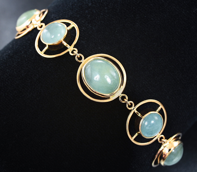 Вашему вниманию предлагается браслет из розового золота 585 пробы с аквамаринами и бериллами! Длина браслета 205 мм, ширина 15 мм. Вес изделия 16,6 г. Ниже приводятся ювелирные характеристики вставок.