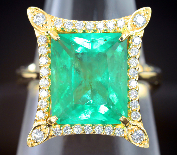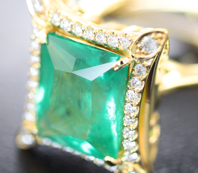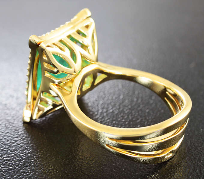 Вашему вниманию предлагается кольцо из желтого золота 585 пробы с уральским изумрудом и 34 бриллиантами! Диаметр дополнительной инкрустации 1,1 мм и 1,5 мм. Площадка 17 х 14 мм, высота 10 мм. Вес изделия 7,6 г. Размер 16,25. Ниже приводятся ювелирные характеристики вставки.