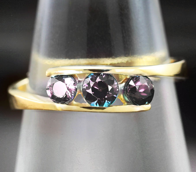 Вашему вниманию предлагается кольцо из желтого золота 585 пробы с гранатами со сменой цвета! При смене освещения камни меняют цвет с зеленого на пурпурновато-красный. Ширина площадки 5 мм, высота 3 мм. Вес изделия 2,2 г. Размер 17,5. Ниже приводятся ювелирные характеристики.