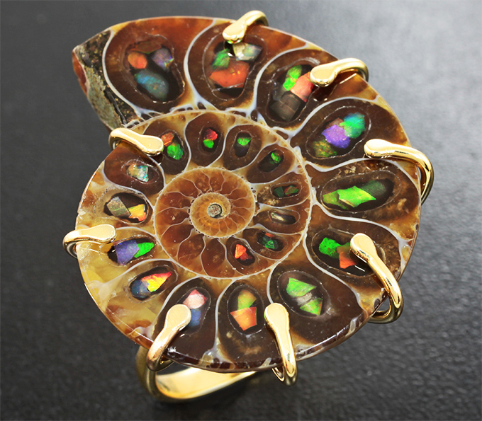Кольцо с аммонитом с аммолитовой мозаикой