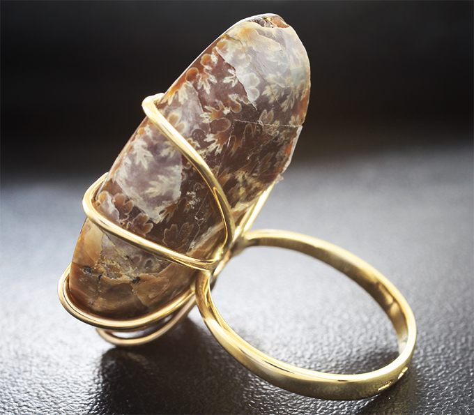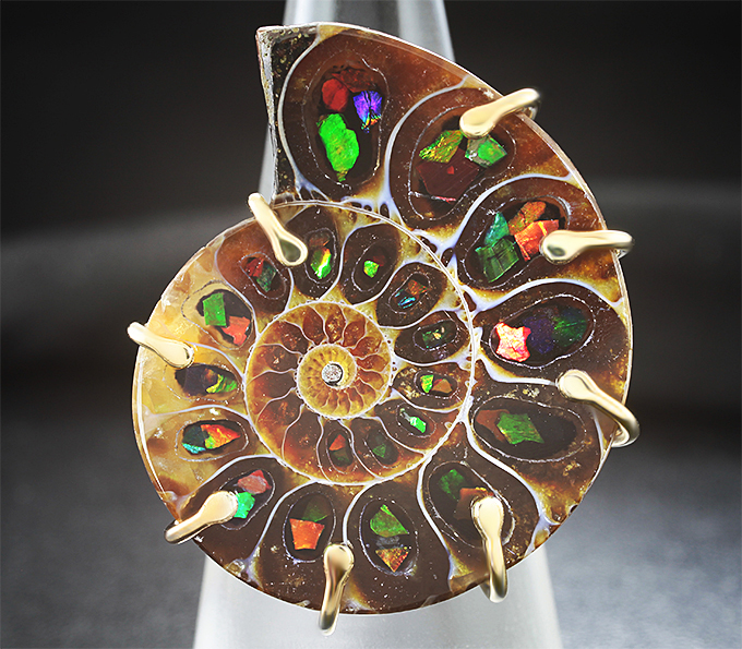 Вашему вниманию предлагается кольцо из желтого золота 585 пробы с аммонитом с аммолитовой мозаикой! Игра всеми цветами радуги! Площадка 34 х 28 мм, высота 8 мм. Вес изделия 11,75 г. Размер 18. Ниже приводятся ювелирные характеристики вставки.