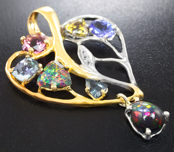 Кулон с кристаллическими черными опалами, сфеном, полихромным турмалином, танзанитами, гранатом со сменой цвета и лейкосапфирами
