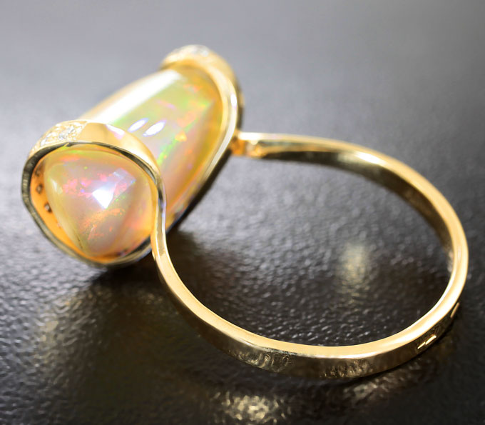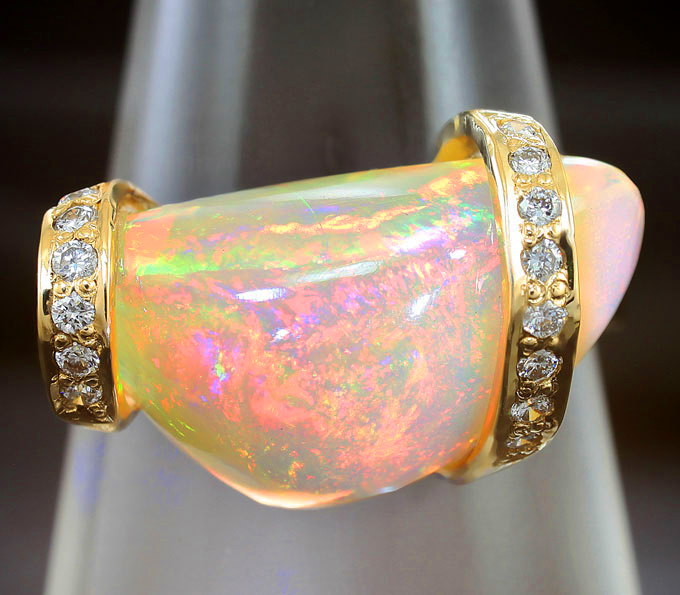 Вашему вниманию предлагается кольцо из желтого золота 585 пробы с превосходным суданским опалом и бриллиантами! Диаметр дополнительной инкрустации 1,25 мм и 1,3 мм. Площадка 19 х 11 мм, высота 9 мм. Вес изделия 3,41 г. Размер 17,75. Ниже приводятся ювелирные характеристики.