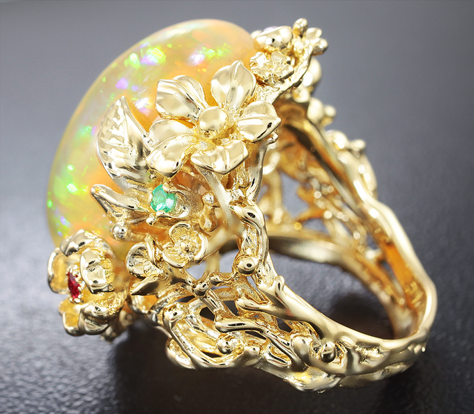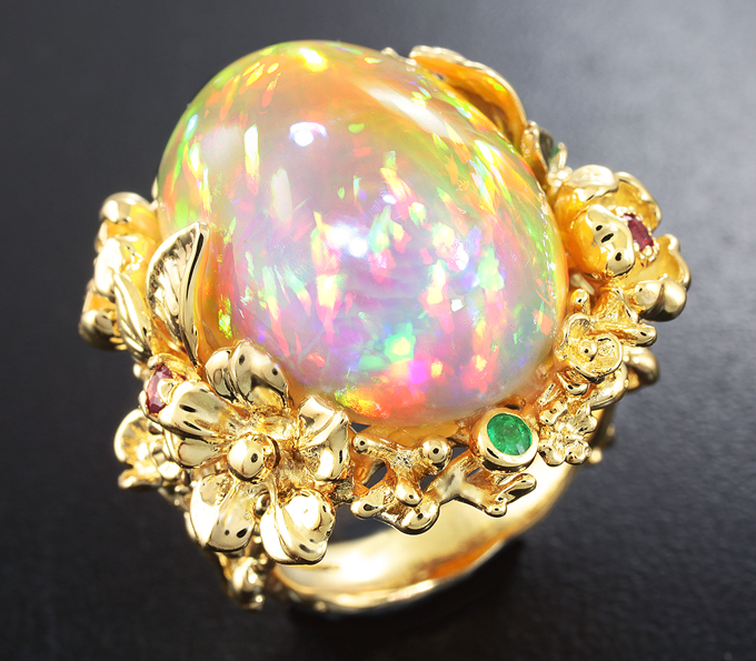 Кольцо с кристаллическим эфиопским опалом, сапфирами и изумрудами