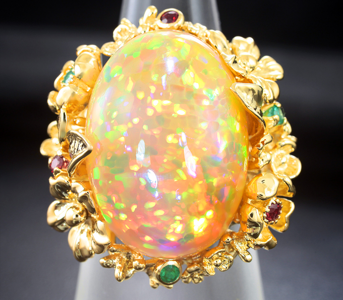 Вашему вниманию предлагается кольцо из желтого золота 585 пробы с кристаллическим эфиопским опалом, сапфирами и изумрудами! Диаметр дополнительной инкрустации 2 мм и 2,5 мм. Площадка 29 х 27 мм, высота 12 мм. Вес изделия 18 г. Размер 17,5. Ниже приводятся ювелирные характеристики опала.