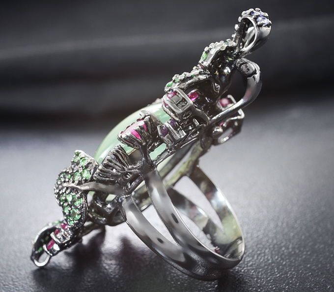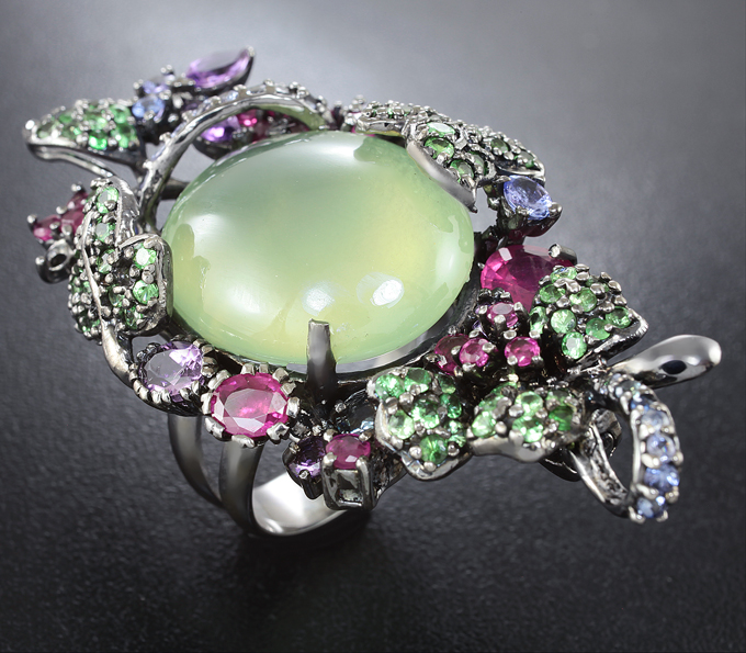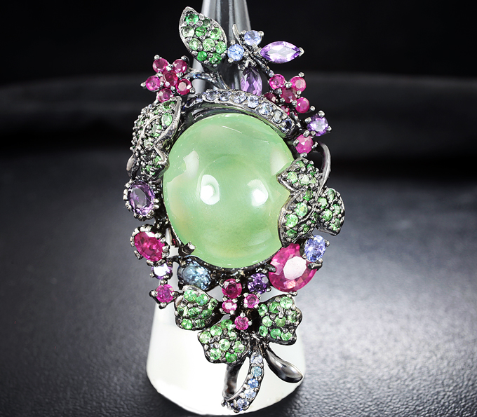 Кольцо с пренитом, рубинами, синими сапфирами, аметистами и цаворитами