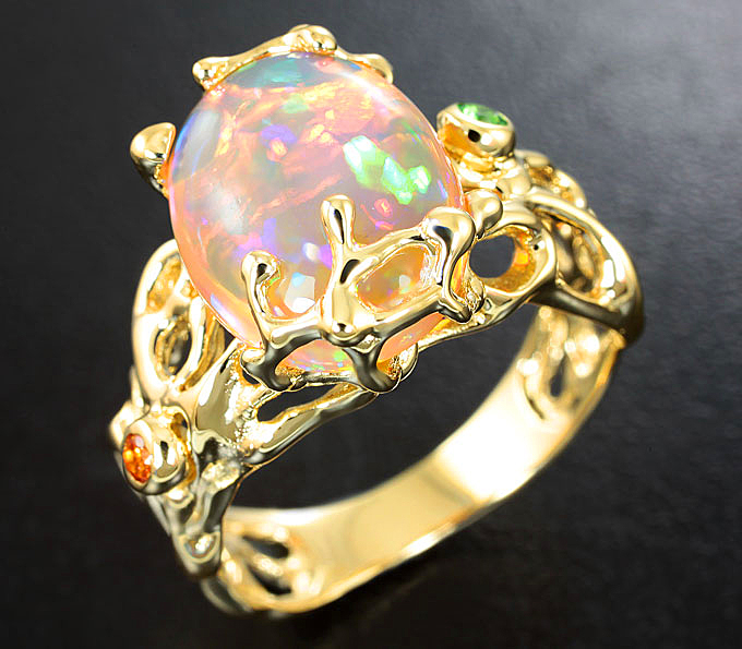 Вашему вниманию предлагается кольцо из желтого золота 585 пробы с суданским кристаллическим опалом, красно-оранжевым сапфиром и цаворитом гранатом! Основные цвета опалесценции: красный, зеленый, голубой и фиолетовый. Диаметр дополнительной инкрустации 2 мм. Площадка 19 х 14 мм, высота 9 мм. Вес изделия 5,1 г. Размер 17,75.