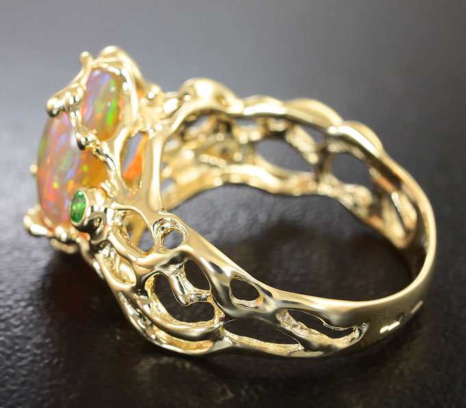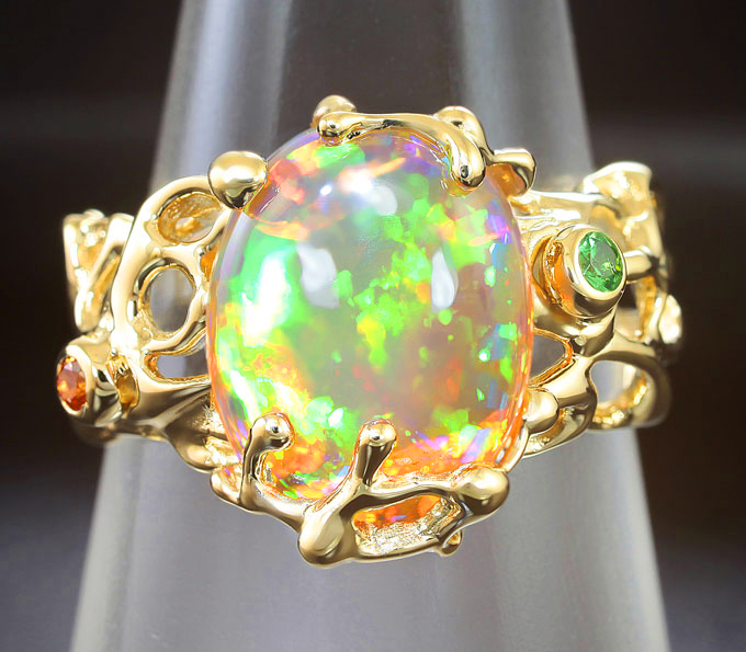 Кольцо с суданским опалом, красно-оранжевым сапфиром и цаворитом гранатом