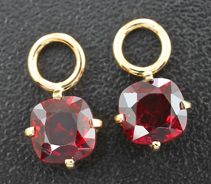 Вашему вниманию предлагаются подвесы для серег из желтого золота 585 пробы с красными шпинелями! Размеры изделия 14 х 8 мм. Вес пары 1,4 г. Ниже приводятся ювелирные характеристики вставок.