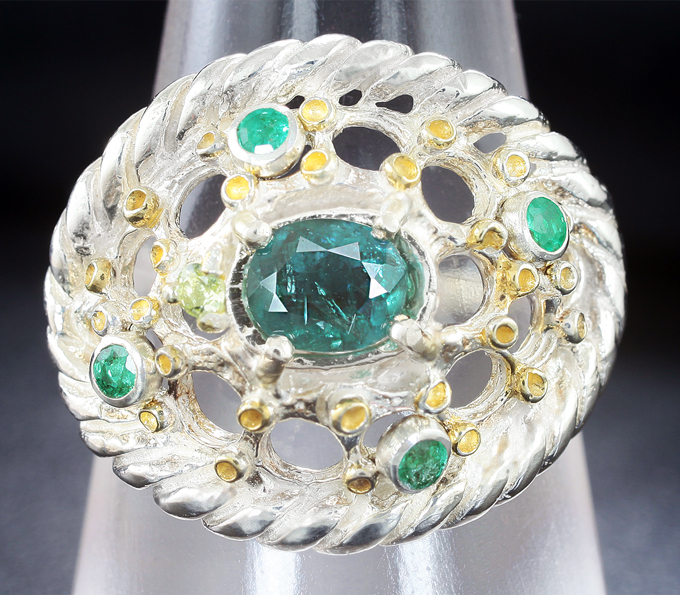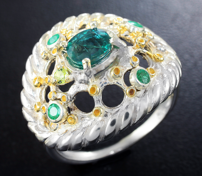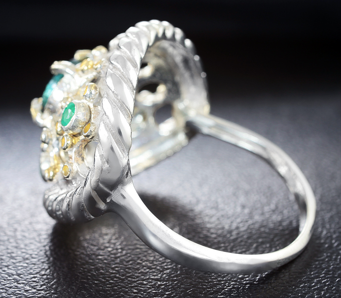 Вашему вниманию предлагается кольцо из стерлингового серебра (925 проба) c грандидьеритом и изумрудами! Изделие частично позолочено. Диаметр дополнительной инкрустации 2 мм. Площадка 23 х 19 мм, высота 7 мм. Вес изделия 5,7 г. Размер 18.