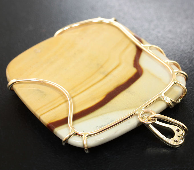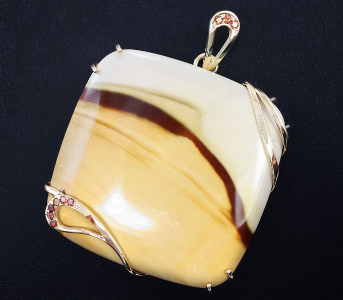 Вашему вниманию предлагается кулон из желтого золота 585 пробы с пейзажной мадагаскарской яшмой и коньячными цирконами! Диаметр дополнительной инкрустации 1,5 мм. Размеры кулона с петлей 53 х 40 мм. Вес изделия 20 г. Ниже приводятся ювелирные характеристики яшмы.
