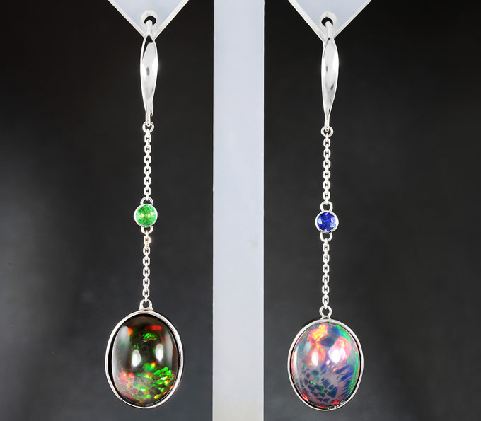 Вашему вниманию предлагаются серьги из белого золота 585 пробы с кристаллическими черными опалами, цаворитами гранатами и синими сапфирами! Основные цвета опалесценции: красный, желтый, зеленый и синий. Диаметр дополнительной инкрустации 3 мм. Размеры серег с петлей 62 х 12 мм. Вес пары 4,8 г. Ниже приводятся ювелирные характеристики опалов.