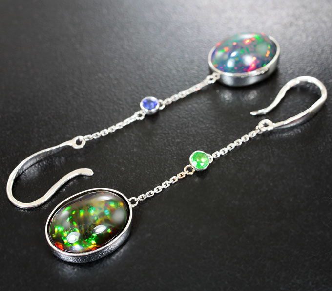 Серьги с кристаллическими черными опалами, цаворитами гранатами и синими сапфирами