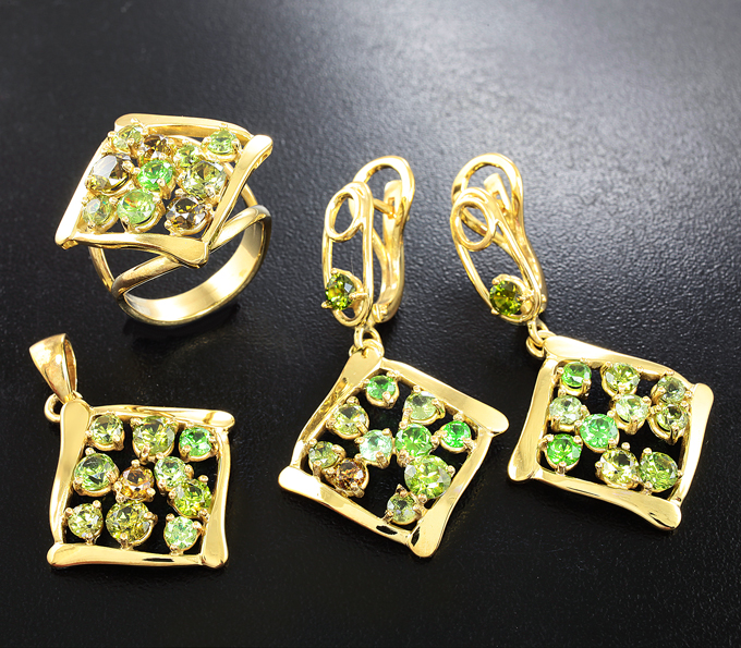 Вашему вниманию предлагается комплект (кольцо + серьги + кулон) из стерлингового серебра (925 проба) с уральскими демантоидами гранатами! Вес комплекта 21,3 г.