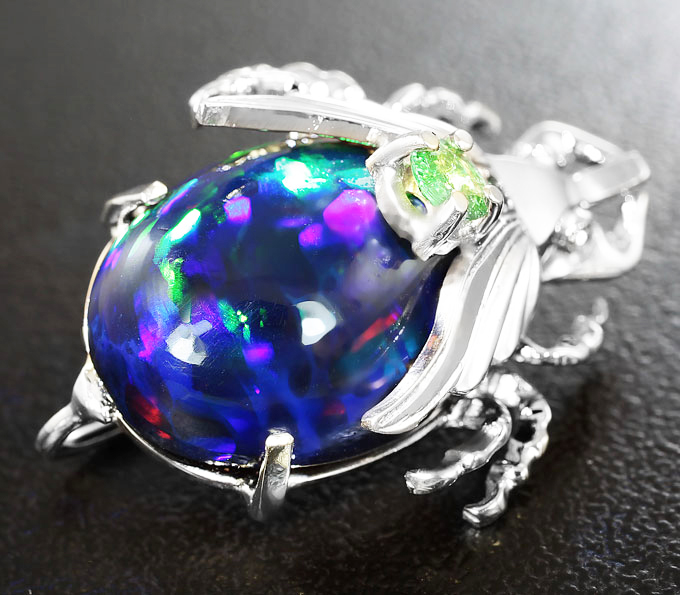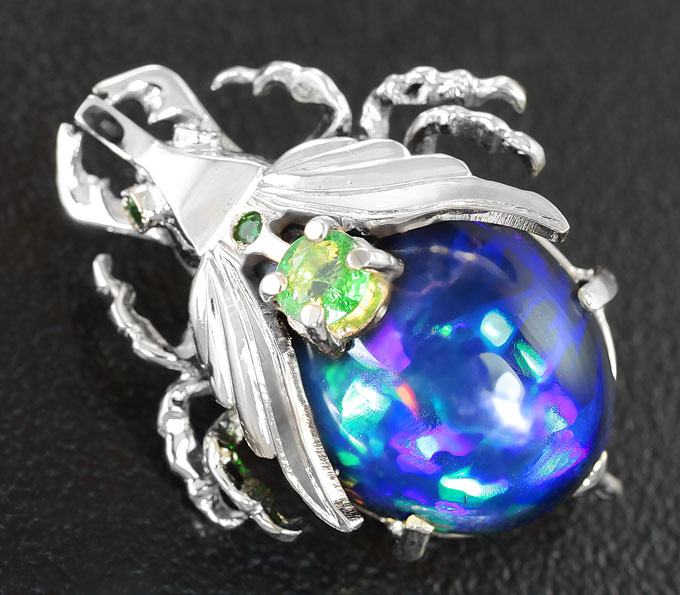 Брошь с кристаллическим черным опалом и цаворитами гранатами