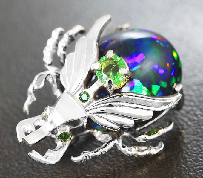 Вашему вниманию предлагается брошь из белого золота 585 пробы с кристаллическим черным опалом и цаворитами гранатами! Диаметр дополнительной инкрустации 1,25 мм и 3 мм. Площадка 25 х 19 мм. Вес изделия 3,9 г. Ниже приводятся ювелирные характеристики опала.
