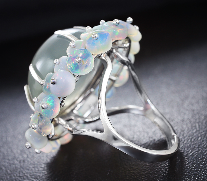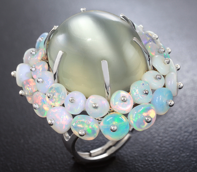 Вашему вниманию предлагается кольцо из белого золота 585 пробы c лунным камнем с эффектом кошачьего глаза и опалами! Основные цвета опалесценции: красный, зеленый и синий. Размеры опалов 4 х 3 мм. Площадка 31 х 29 мм, высота 13 мм. Вес изделия 11,2 г. Размер 16,75. Ниже приводятся ювелирные характеристики вставки.