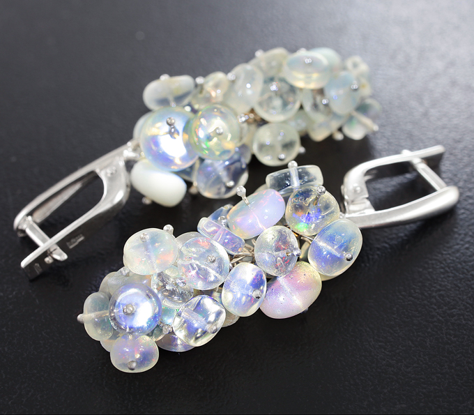 Вашему вниманию предлагаются серьги из белого золота 585 пробы с кристаллическими эфиопскими опалами! Основные цвета опалесценции: красный, желтый, зеленый и синий. Диаметр вставок от 4 мм до 6 мм. Размеры серег с петлей 44 х 14 мм. Вес пары 8,5 г.