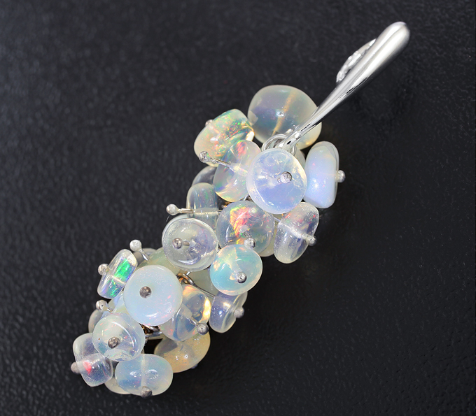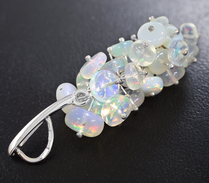 Вашему вниманию предлагается кулон из белого золота 585 пробы с кристаллическими эфиопскими опалами! Основные цвета опалесценции: красный, желтый и зеленый. Диаметр вставок от 4 мм до 7 мм. Размеры кулона с петлей 43 х 13 мм. Вес изделия 3,7 г.