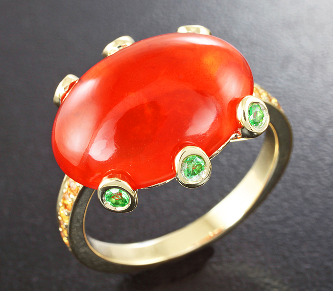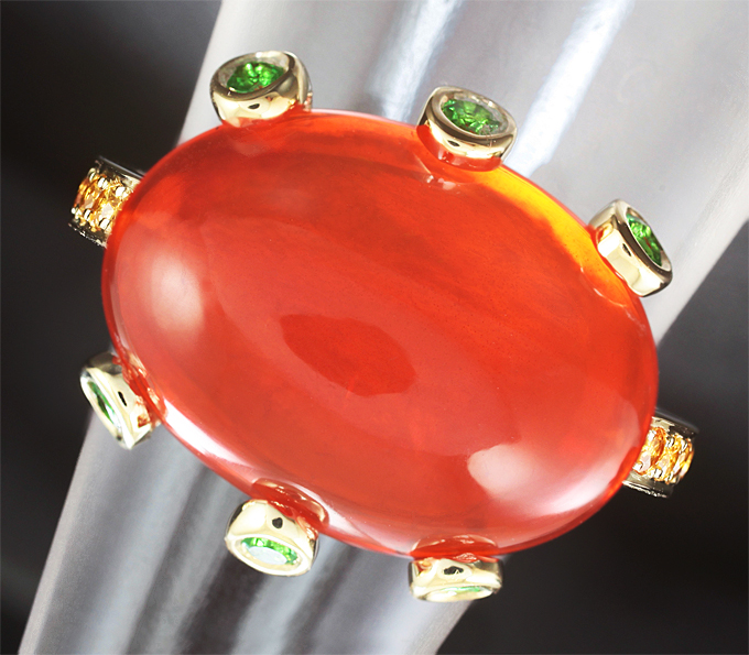 Кольцо c мексиканским огненным опалом, цаворитами гранатами и оранжевыми сапфирами