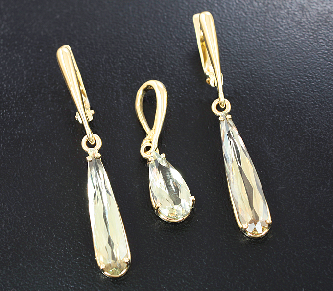 Вашему вниманию предлагается комплект (серьги + кулон) из желтого золота 585 пробы с диаспорами массой 7,07 карата! Размеры вставок 13 х 6 мм и 21 х 5 мм. Вес комплекта 5,3 г.