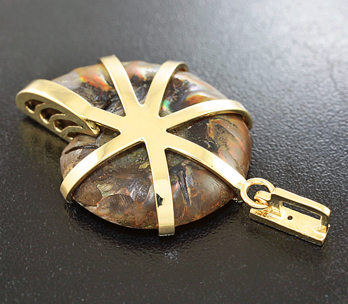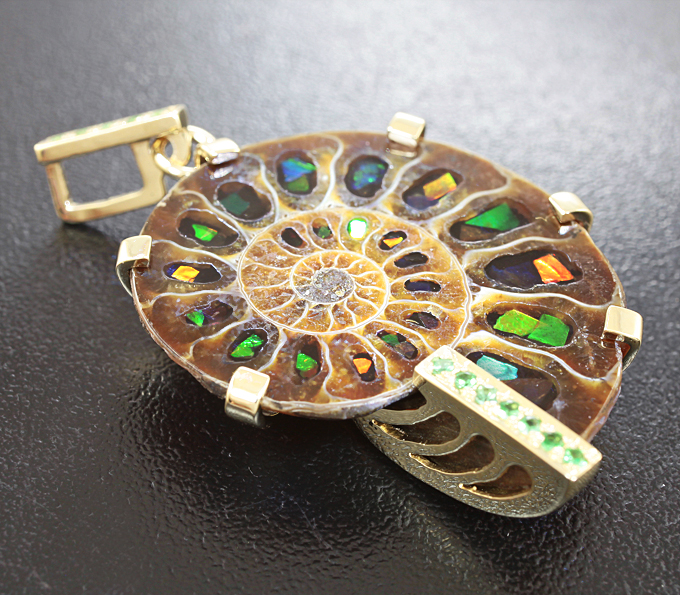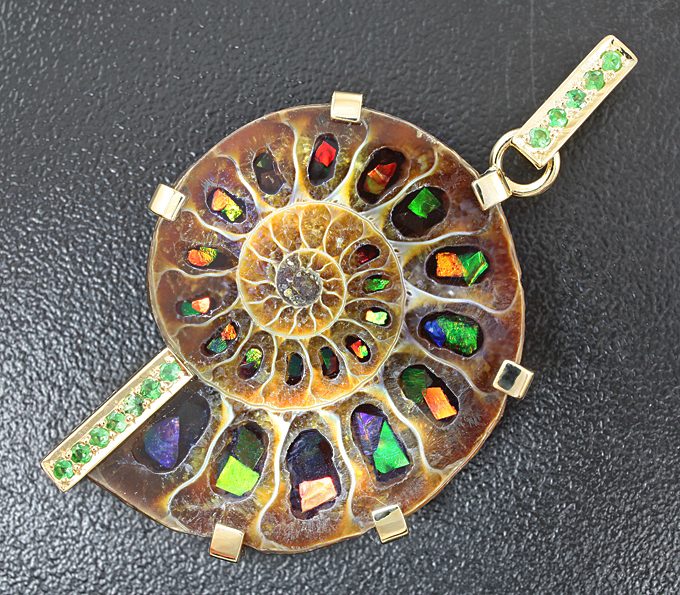 Кулон с крупным аммонитом с мозаикой аммолита и цаворитами