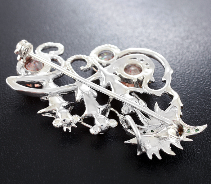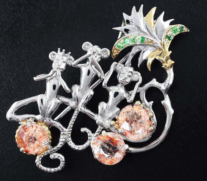 Брошь «Три обезьяны» c солнечным камнем и цаворитами