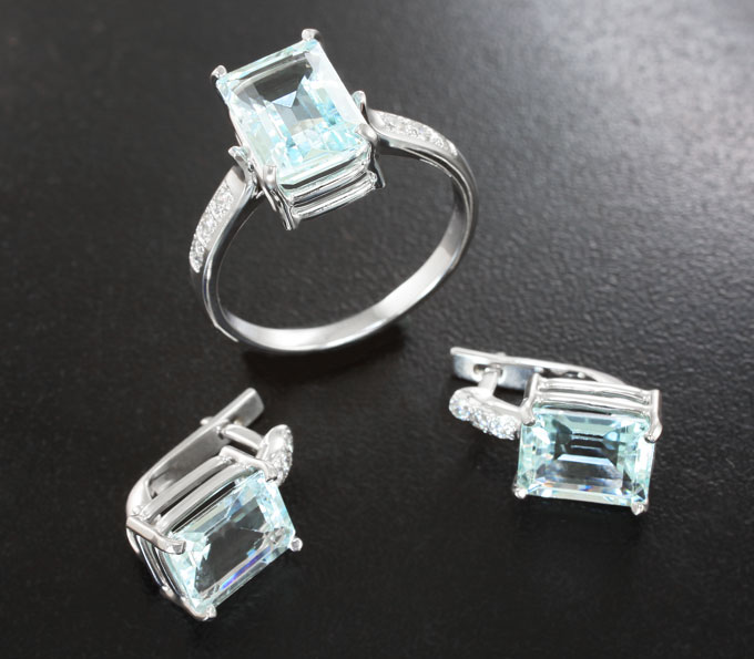 Вашему вниманию предлагается комплект (кольцо + серьги) из белого золота 585 пробы с аквамаринами 7,14 карат и бриллиантами! Размеры аквамаринов 9 х 7 мм и 11 х 7 мм, диаметр бриллиантов 1,6 мм и 2 мм. Вес комплекта 8 г.